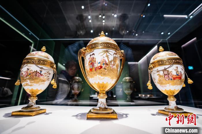 圖為凡爾賽宮藏“彩繪描金中國人物圖鑲銅鍍金高足蛋形瓶(一套)”展品吸引觀眾參觀。中新網(wǎng)記者 侯宇 攝