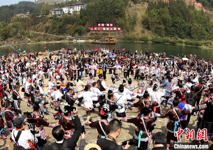 2024年3月11日,在廣西三江侗族自治縣梅林鄉(xiāng),“二月二”侗族大歌節(jié)活動(dòng)吸引游客前來(lái)體驗(yàn)侗鄉(xiāng)風(fēng)情。圖為民眾在跳多耶舞?! 蔷殑?nbsp;攝