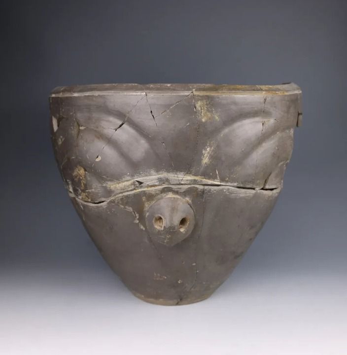 然而,馬家窯人的藝術(shù)創(chuàng)造力似乎遠不止于此。寺洼遺址新出土的眾多陶器展現(xiàn)出全新的造型與紋飾風(fēng)格。如其中一件帶有“豬鼻”的馬家窯類型泥質(zhì)灰陶,色澤深沉灰黑如夜,一只鼻子自陶胎中緩緩隆起,上方的弧形紋理像舒展的眉骨,又像張開的羽翼,一場古文明的夢境由此展開。