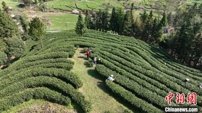 中部省份江西是中國茶葉主產(chǎn)區(qū)之一。上猶縣是贛南高山茶核心產(chǎn)區(qū),漫山遍野的茶樹郁郁蔥蔥,游客穿梭其中,體驗采摘今年的頭茬新綠。