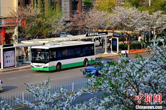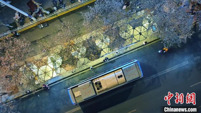 3月26日,被譽(yù)為武漢“最美櫻花車站”的珞喻東路大黃村公交站櫻花盛放。經(jīng)過(guò)改造的大黃村公交站,新增了自助售貨機(jī)、衛(wèi)生間、共享充電寶等便民設(shè)施,煥然一新的科技智慧站臺(tái)與粉白如霞的櫻花相映生輝。微風(fēng)吹過(guò),櫻花花瓣浪漫飄零,吸引不少市民游客觀賞“打卡”。圖為公交車在珞喻東路大黃村公交站停留。(無(wú)人機(jī)照片)劉康 攝