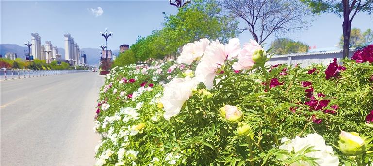 立夏之際,榆中縣興隆山大道兩旁各式各樣的牡丹花競相開放,白的、粉的、紫的花朵嬌艷欲滴;和平天香山、范家營、牡丹園、高崖湖灘、馬坡上莊、城關(guān)大坡坪、馬啣山麓……高山大河的榆中,從每年的4月底到8月,隨著階梯狀的地勢變化,由北而南,延伸了牡丹花的觀賞期限,更使得當(dāng)?shù)厝罕娒撠氈赂?,笑如花開。