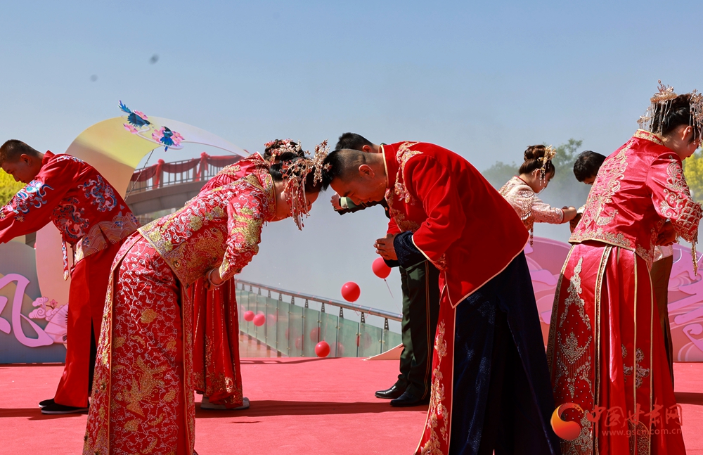 活動現場,古色古香的布置與悠揚婉轉的禮樂相得益彰。參加集體婚禮的新郎、新娘走過連心橋,共同牽繡球入場,舉行拜天地、行合巹禮等傳統儀式,一揖一禮間盡顯中式婚禮的莊重典雅與浪漫情懷,每一個環(huán)節(jié)都飽含著對新人的美好祝福。