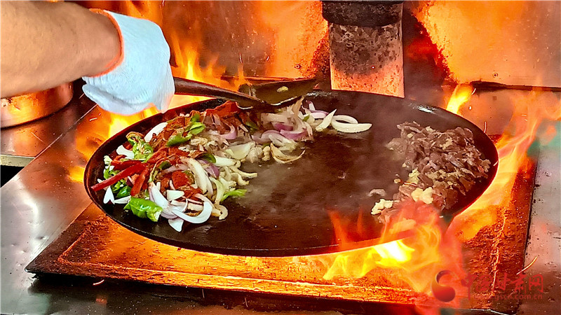 后來這種烹飪方式漸漸被當(dāng)?shù)匕傩諏W(xué)會(huì)并加以改良,以牛、羊雜為主要食材,放在鐵鏊子上炒制,山丹炒撥拉由此而來。