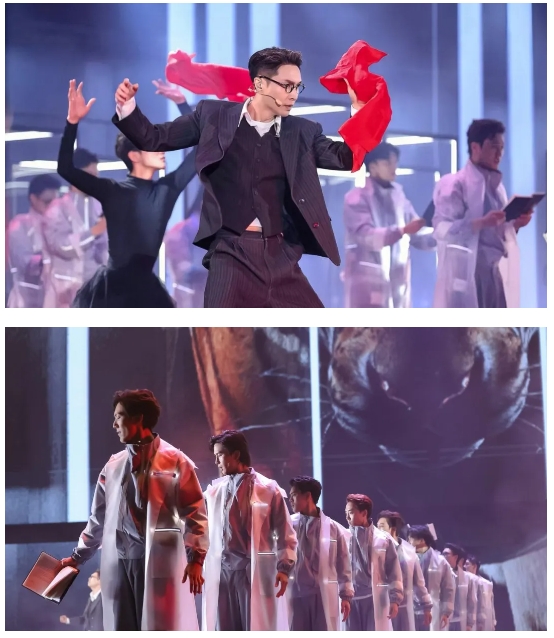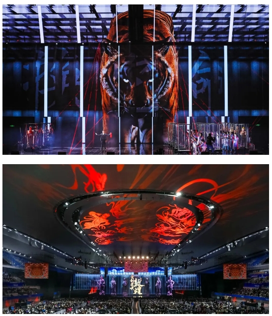 該劇最大的亮點在于創(chuàng)新性藝術(shù)融合,將非遺、科技、禪意、潮流、AI融入先鋒音樂話劇,打破傳統(tǒng)觀演模式和傳統(tǒng)舞臺結(jié)構(gòu),巧妙植入演唱會、音樂劇、話劇、舞劇甚至是電影多種藝術(shù)表現(xiàn)形式,通過人工智能、影視化、動畫真人融合等最新科技賦能舞臺,實現(xiàn)“戲劇+影視+Live”多種藝術(shù)場域的融合,“創(chuàng)造”了既現(xiàn)代又滿載中國審美的“敦煌”空間,讓觀眾沉浸體驗敦煌文化的輝煌與魅力。