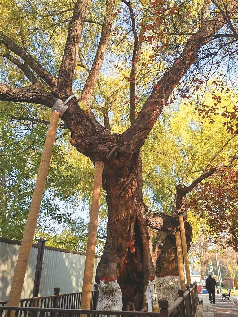 行至平沙落雁,路旁綠草之上,一株百年文冠果樹(shù)上果實(shí)累累,宛如哨兵般靜靜守候,為熱鬧的街市增添了幾分寧?kù)o。在綠色公園內(nèi),一株700年樹(shù)齡的古國(guó)槐枝繁葉茂。復(fù)古的支架穩(wěn)穩(wěn)支撐著枝干,既確保它在歲月中安然生長(zhǎng),又透出滄桑之感?;◢弾r圍欄環(huán)繞四周,其上雕刻的荷葉荷花圖案栩栩如生,“愛(ài)護(hù)樹(shù)木”“保護(hù)生態(tài)”等文字清晰可見(jiàn),無(wú)聲地倡導(dǎo)著人們保護(hù)環(huán)境、愛(ài)護(hù)植物。退休教師王淑芬正帶著小孫女玩耍,她笑著說(shuō):“這兒空氣好,景色美,每天帶孩子來(lái)親近古樹(shù),也是在給她種下愛(ài)護(hù)自然的種子。”游客的歡笑聲、孩童的嬉戲聲與清脆的鳥(niǎo)鳴聲交織在一起,為古樹(shù)增添了別樣的活力。