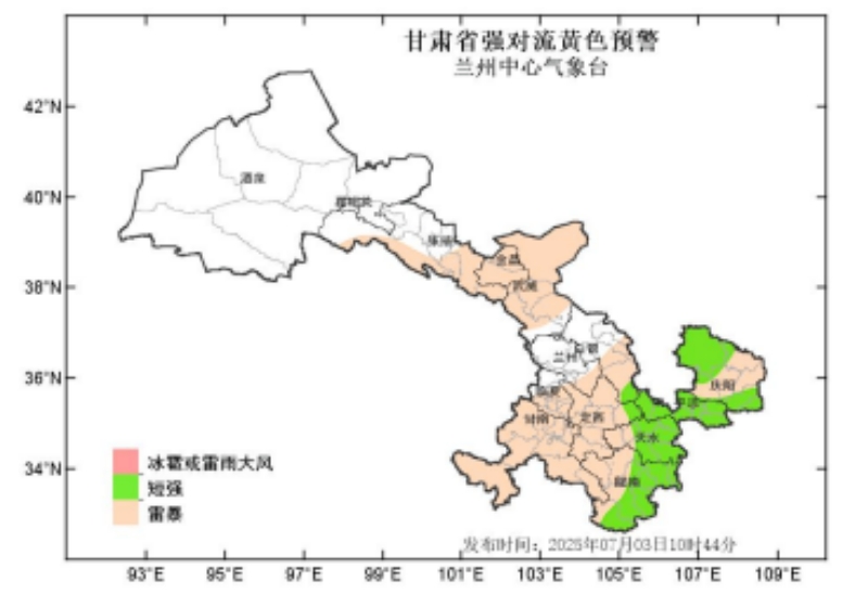 蘭州中心氣象臺2025年7月3日10時44分繼續(xù)發(fā)布強對流黃色預(yù)警:預(yù)計未來24小時,張掖、金昌、武威、蘭州、白銀、甘南、臨夏、定西、隴南、天水、平?jīng)?、慶陽等州市有雷暴,其中隴南、天水、平?jīng)?、慶陽等市部分地方及白銀、定西兩市局部地方有短時強降水,最大小時雨強20-60mm;隴南、天水、平?jīng)?、慶陽等市強降水在未來24小時內(nèi)多發(fā),白銀、定西主要強降水時段在4日2-8時。請注意防范!