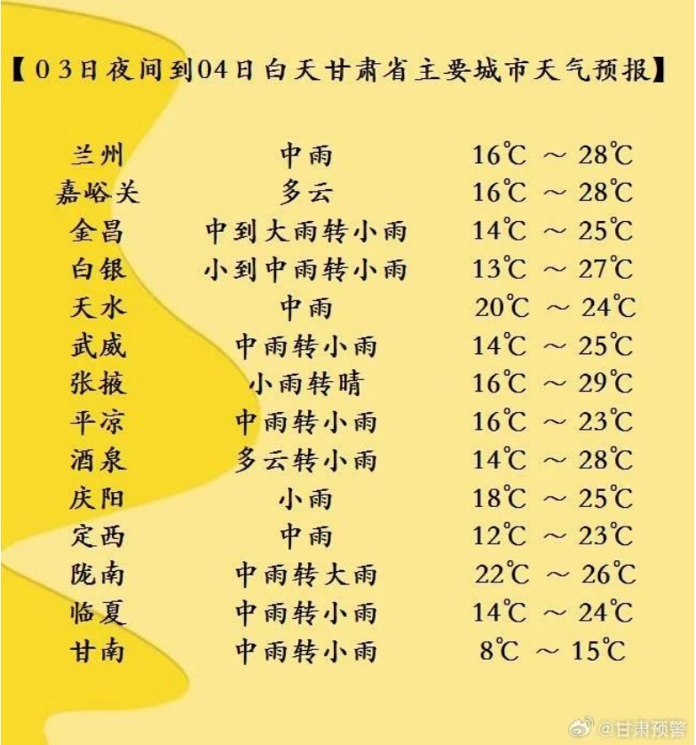 今天夜間到明天白天(7月3日20時-7月4日20時),酒泉、嘉峪關(guān)、張掖三市多云間陰,局部地方有小雨,祁連山區(qū)有中到大雨;省內(nèi)其余地方陰有小到中雨,其中隴南、天水、平?jīng)?、慶陽等市局部地方及定西、甘南兩市州東部、白銀市南部有暴雨。