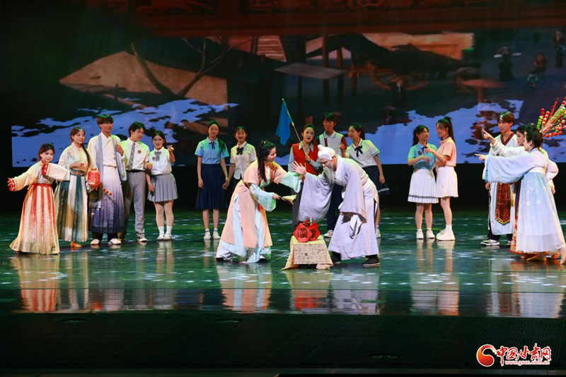 詩會以涼州詞為核心意象,主體分為“涼州·思”“涼州·行”“涼州·吟”“涼州·樂”四個篇章,各有側(cè)重又層層遞進,全方位展現(xiàn)涼州文化的多元魅力。第一篇章“涼州·思”以《天馬歌》的朗誦、《邊塞詩情》的情景劇與《鼓韻風華》的表演,共同勾勒天馬傳奇與戍邊情懷,展現(xiàn)涼州深沉雄健的文化基因;第二篇章“涼州·行”借助AI主持與情景演繹,串聯(lián)起情景劇《跟著詩詞游武威》,以科技+文旅的視角,帶領觀眾開啟了一場沉浸式漫游;第三篇“涼州·吟”以《西涼樂舞》、音詩畫《涼州詞》等多元舞臺形式吟誦涼州詞章的雋永風流,對誦表演《古涼新韻》,以“古今對話”解鎖涼州文化密碼,誦讀者交替誦讀“舊八景”與“新八景”組詩,從《大云晚鐘》《黃羊秋牧》等古景詩,到《河西都會》《摘星小鎮(zhèn)》等新景作,舞臺上“聲、形、畫、墨”交織,盡顯涼州古今風貌,引得觀眾沉醉鼓掌;第四篇“涼州·樂”情景再現(xiàn)了《涼州夜宴》,品味葡萄美酒中的絲路情韻;尾聲“詩意涼州·藝游武威”,全場共同唱響對涼州的禮贊,并以“等你在涼州”發(fā)出誠摯邀約,讓千年涼州的詩意與魅力,在新時代持續(xù)綻放光彩。