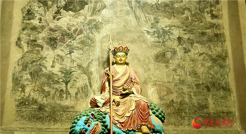 這幅壁畫繪于大佛殿內(nèi)大佛身后墻壁,色彩雖已斑駁,卻仍難掩其藝術(shù)價值,是大佛殿內(nèi)時代較早、藝術(shù)水準極高的作品。它距地面高1.55米,上下兩端用墨線勾出邊欄,邊欄內(nèi)繪纏枝牡丹點綴;《西游記》故事圖居于正中,殘長約4.4米,殘高約2.9米,面積約12.7平方米,壁畫前今塑有地藏王菩薩像一尊。壁畫由“取水子母河”“道昧放心猿”“大戰(zhàn)紅孩兒”等多個獨立故事組成,畫面里險山怪石、古木溪水、云霧火海錯落交織,而師徒四人的分工設(shè)定始終清晰:豬八戒挑行李、沙僧牽馬、孫悟空持金箍棒護送,這份“固定分工”讓豬八戒的勤勞形象貫穿全程。