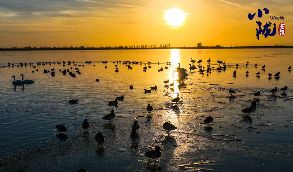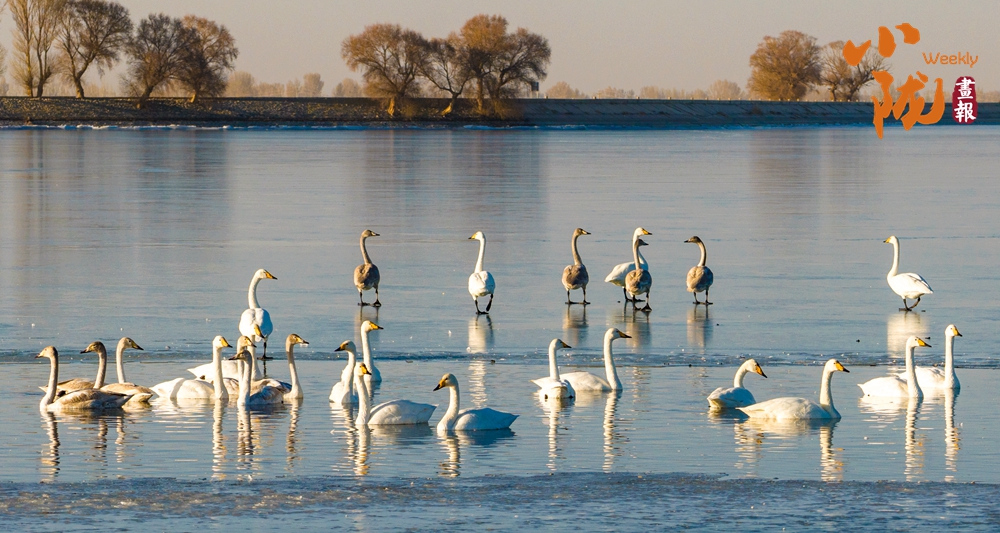 陽光斜照,萬物生暖。水面上,成群的白天鵝不緊不慢地游著,雪白的身影倒映水中,隨著微波輕輕蕩漾,像是一幅流動的水墨畫,素雅而安寧。